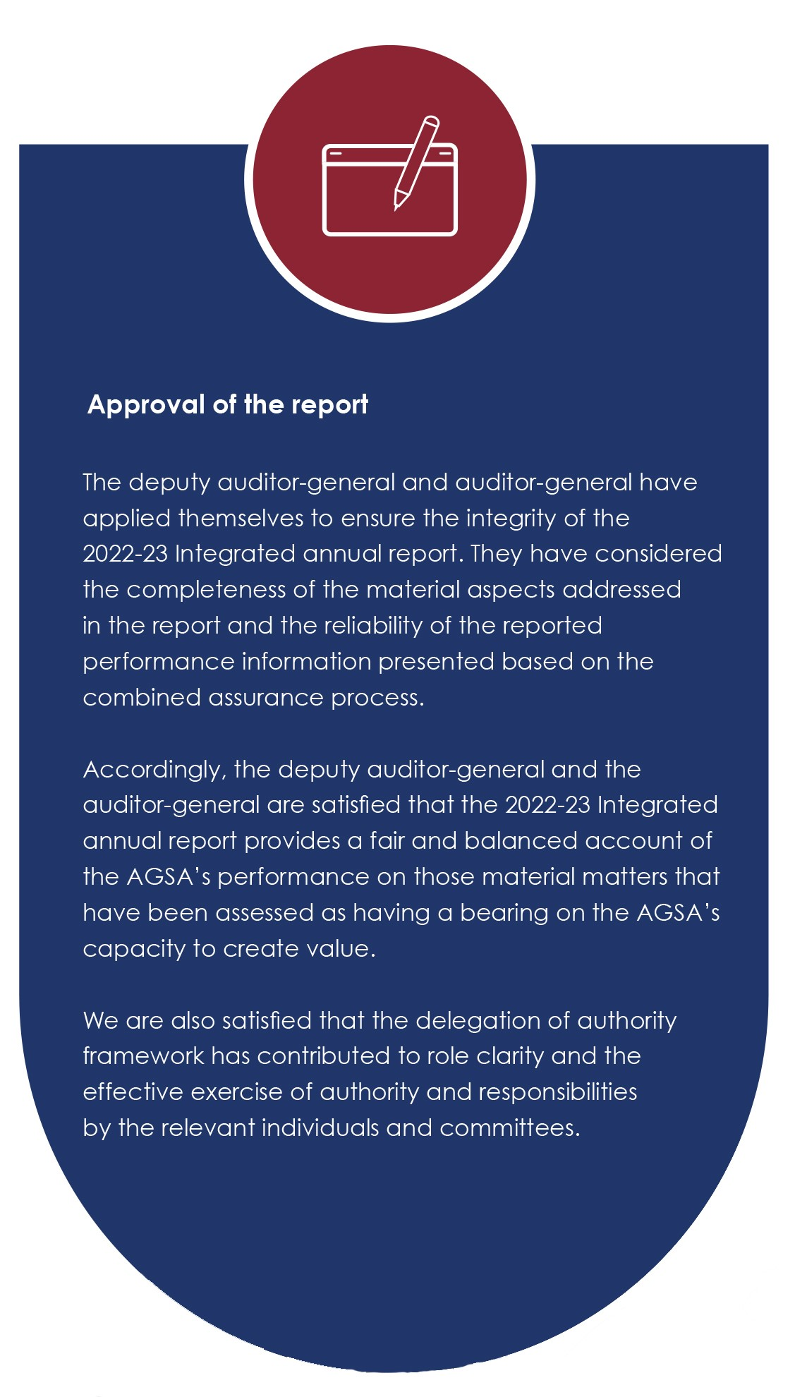 Our integrated approach to reporting is a result of applying integrated thinking to defining the imperatives for creating long-term, sustainable value for our stakeholders. This report covers the performance of all AGSA business units, including our head office and our offices across the nine provinces.