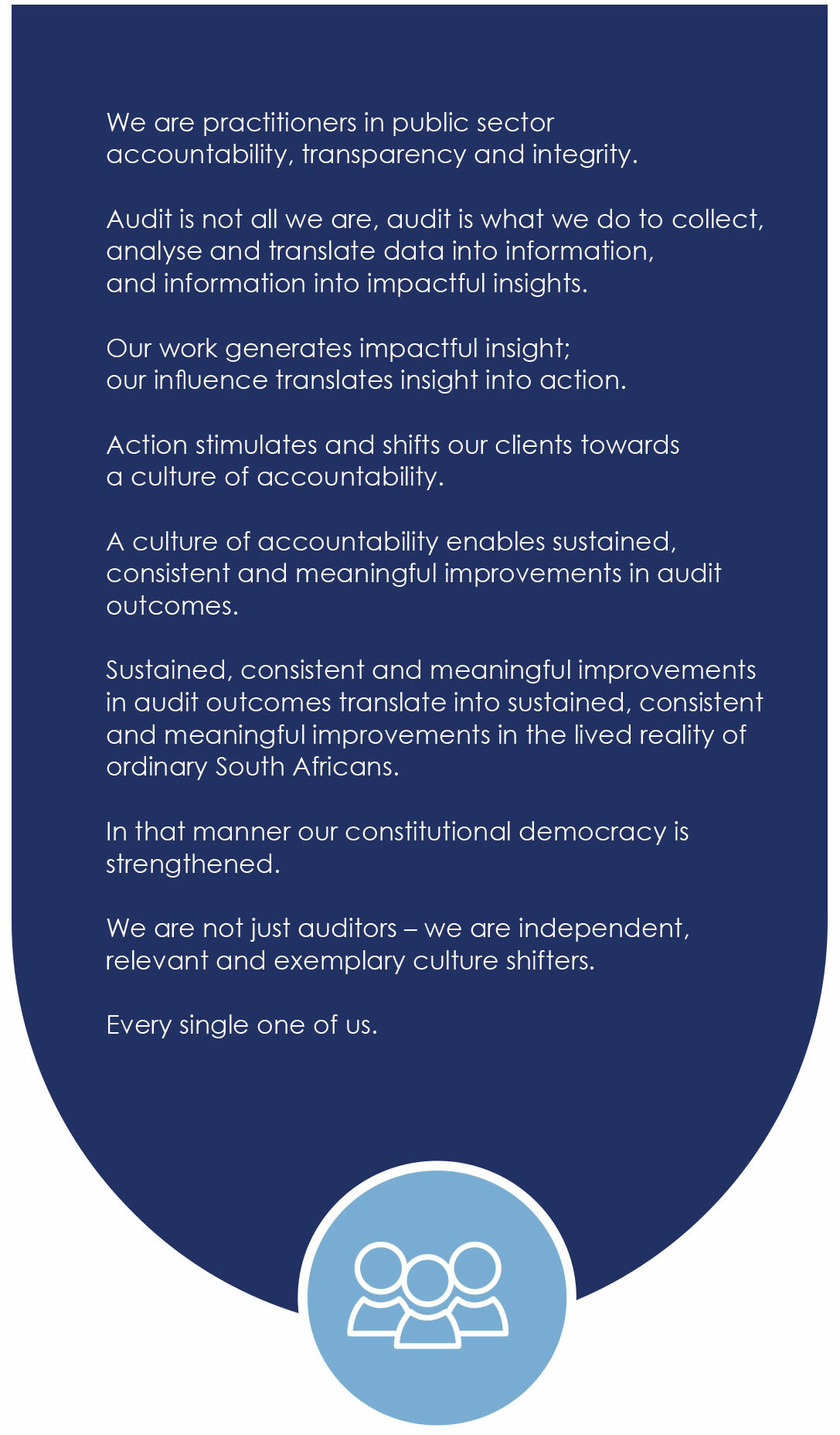 We envisage that by 2030, the AGSA will be associated with a meaningful and sustainable shift of public sector culture to one of performance, accountability, transparency and integrity.