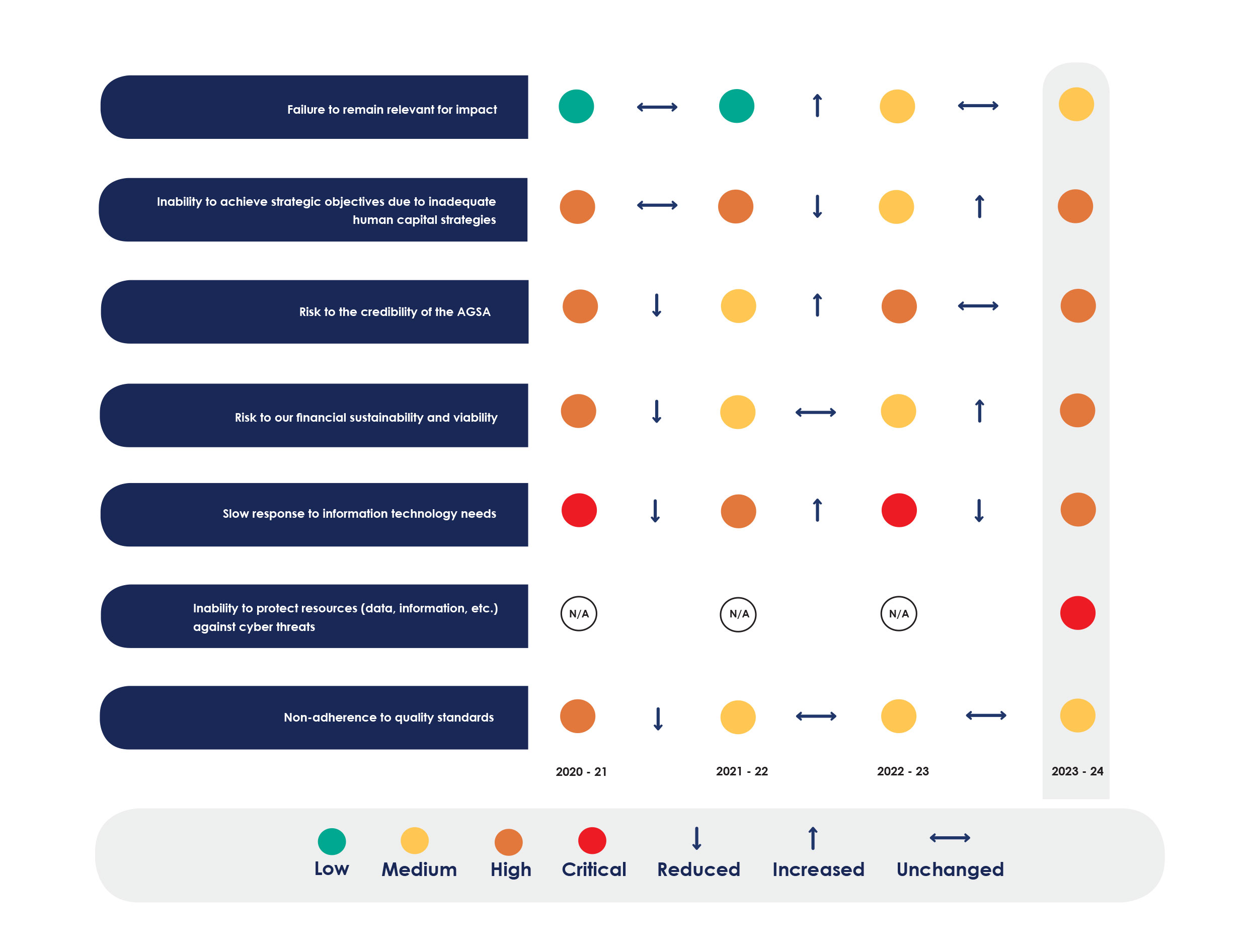 The implementation of the mitigations for the strategic risks identified in 2021-22 and 2022-23 was rigorously monitored over the year, periodically assessing the various risk indicators. We are satisfied with the efforts to mitigate risk and action that owners took to address risk exposure.