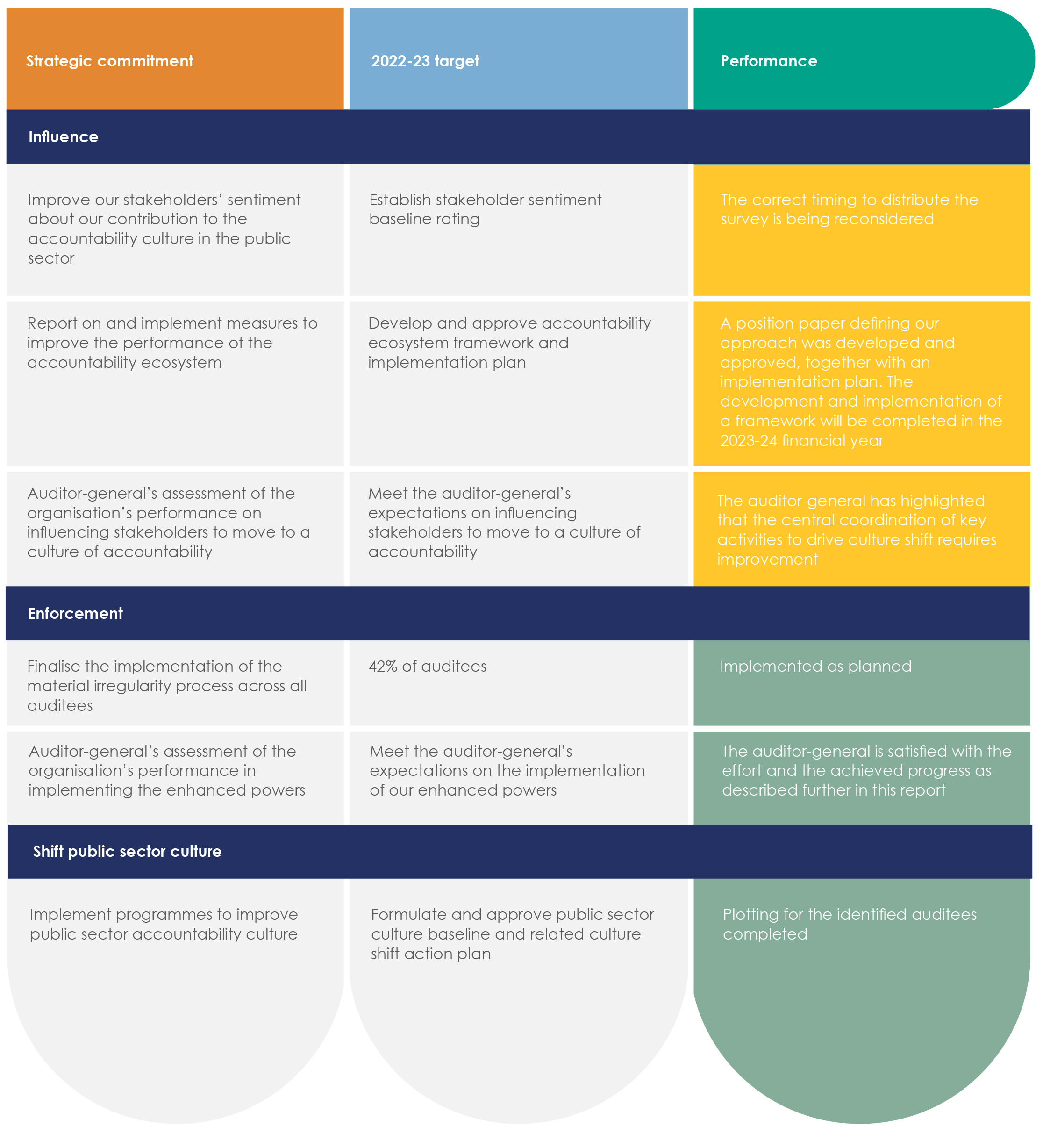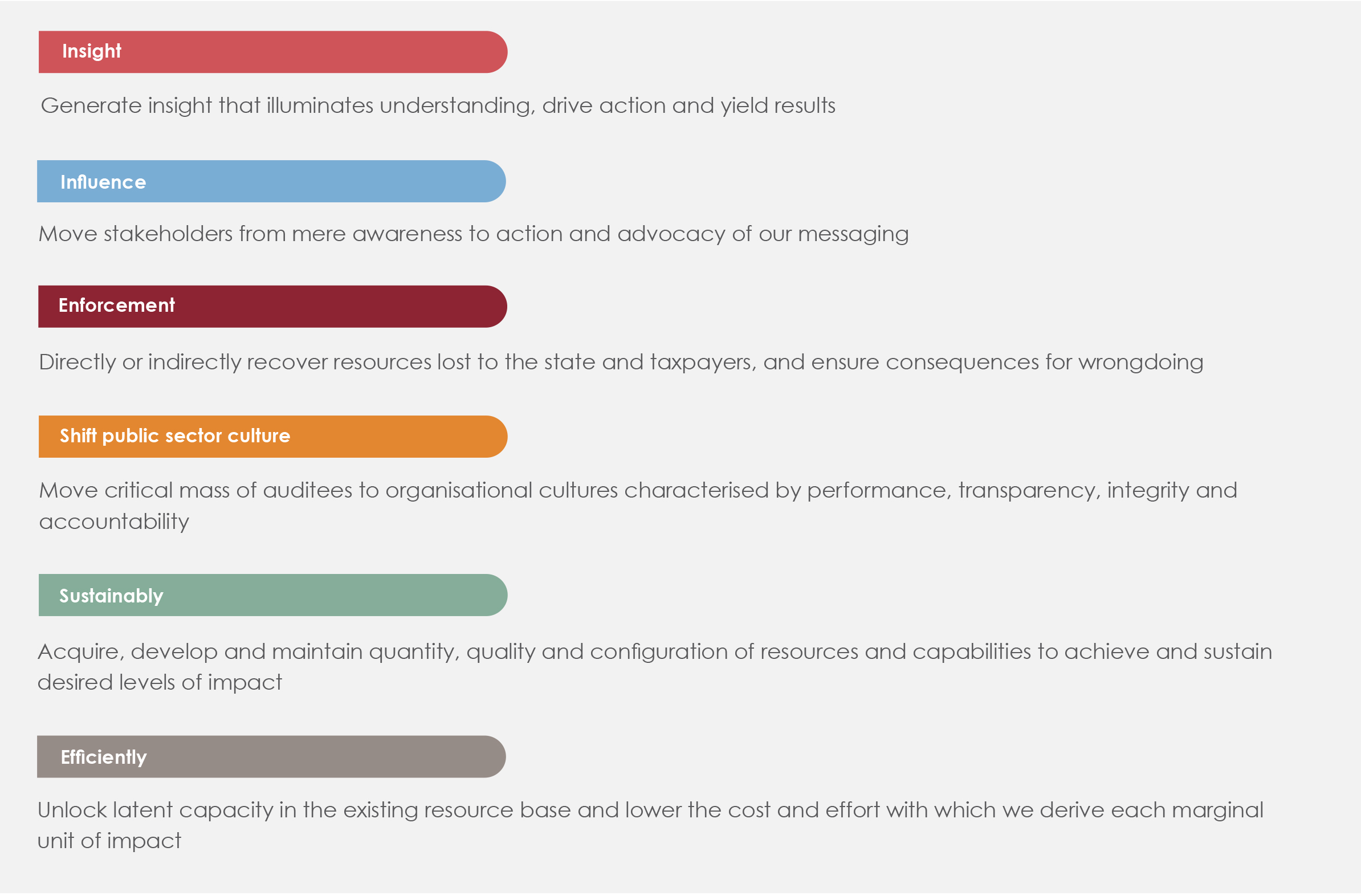 Our strategic aspiration is that over the next six years we will make a stronger, more direct and consistent impact on the lived reality of ordinary South Africans by sustainably and efficiently shifting public sector culture through insight, influence and enforcement.