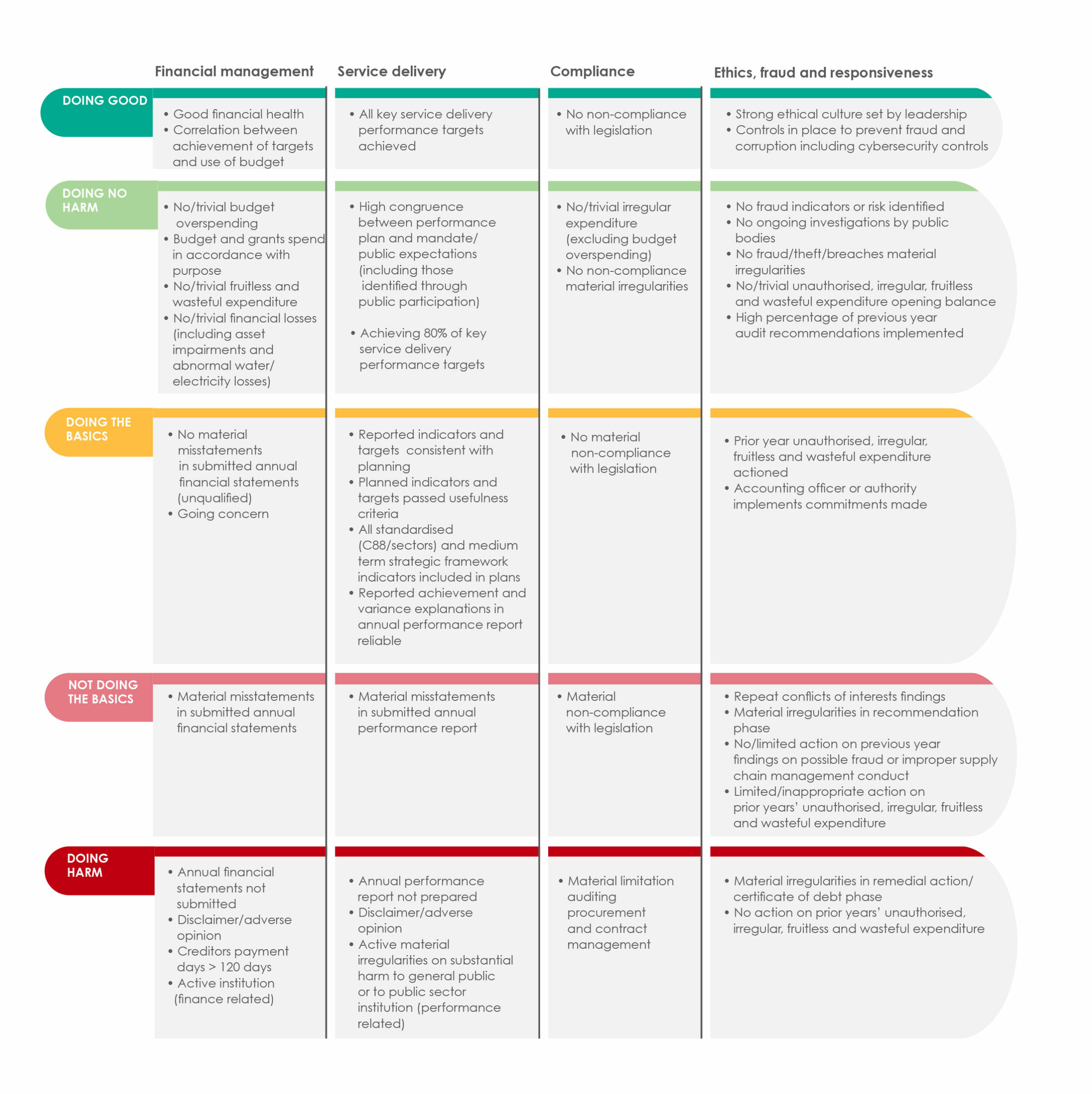 These definitions will guide our assessment of the status of public sector institutions, determine the focus of our work to provide insight and apply the right level of enforcement, engage our stakeholders in the accountability ecosystem, and inform the way in which we express ourselves in our reports.